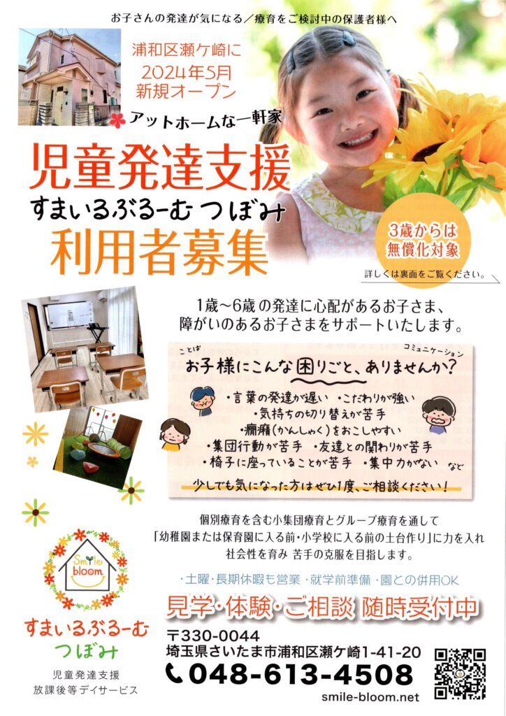 令和6年5月1日 すまいるぶるーむ・つぼみ(瀬ケ崎1丁目)オープンしました!